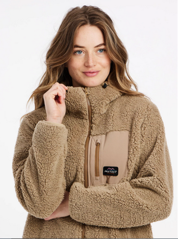 Ženska 'teddy' flis jakna s kapuco, dva stranska in prsni žep z zadrgo.Sestava: 100% poliesterBarva: bež
