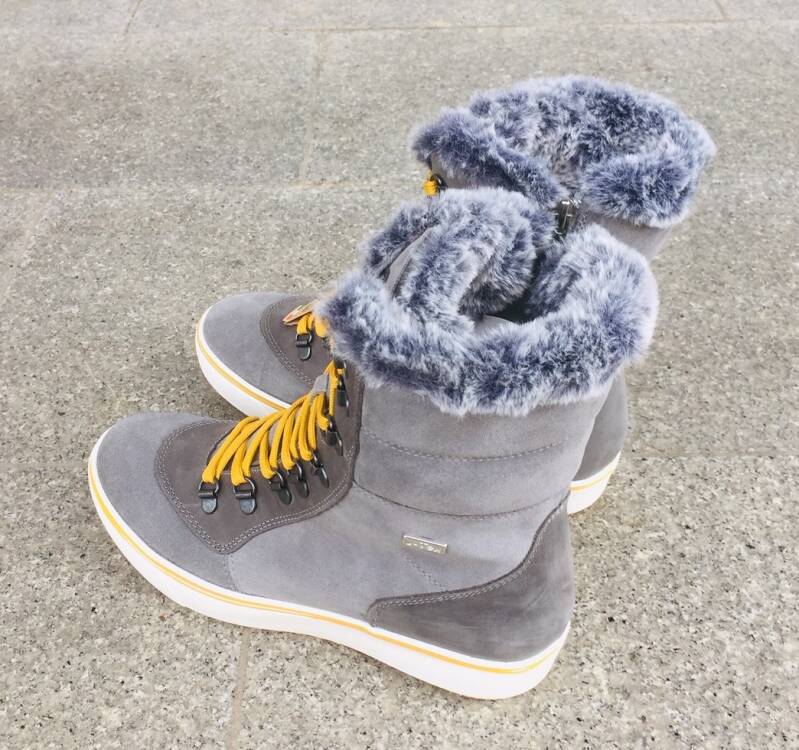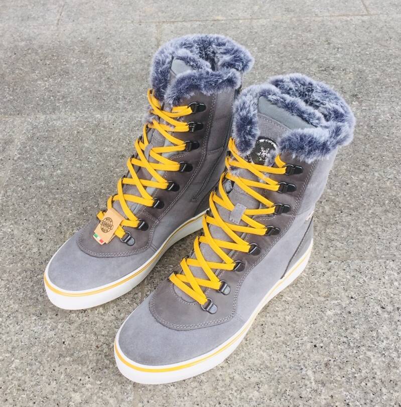 Ženski usnjeni športno elegantni zimski škorenjčki z vodoodbojno membrano, toplo podlogo iz blaga, rahlo dvignjenim gumijastim podplatom. Izredno topli. Za lažje obuvanje je na voljo zadrga. Barva: siva in rumene vezalke.