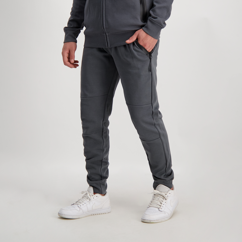 Moške športne trenirka hlače, z gumirano zadrgo na žepih, patentom na hlačnici.Sestava: 78% bombaž, 22% poliesterBarva: siva
