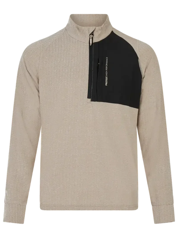 Moška aktiv termo majica Protest z ovratnikom, prsni žep, ščitnik za brado.Sestava: 93% poliester, 7% elastanBarva: bež