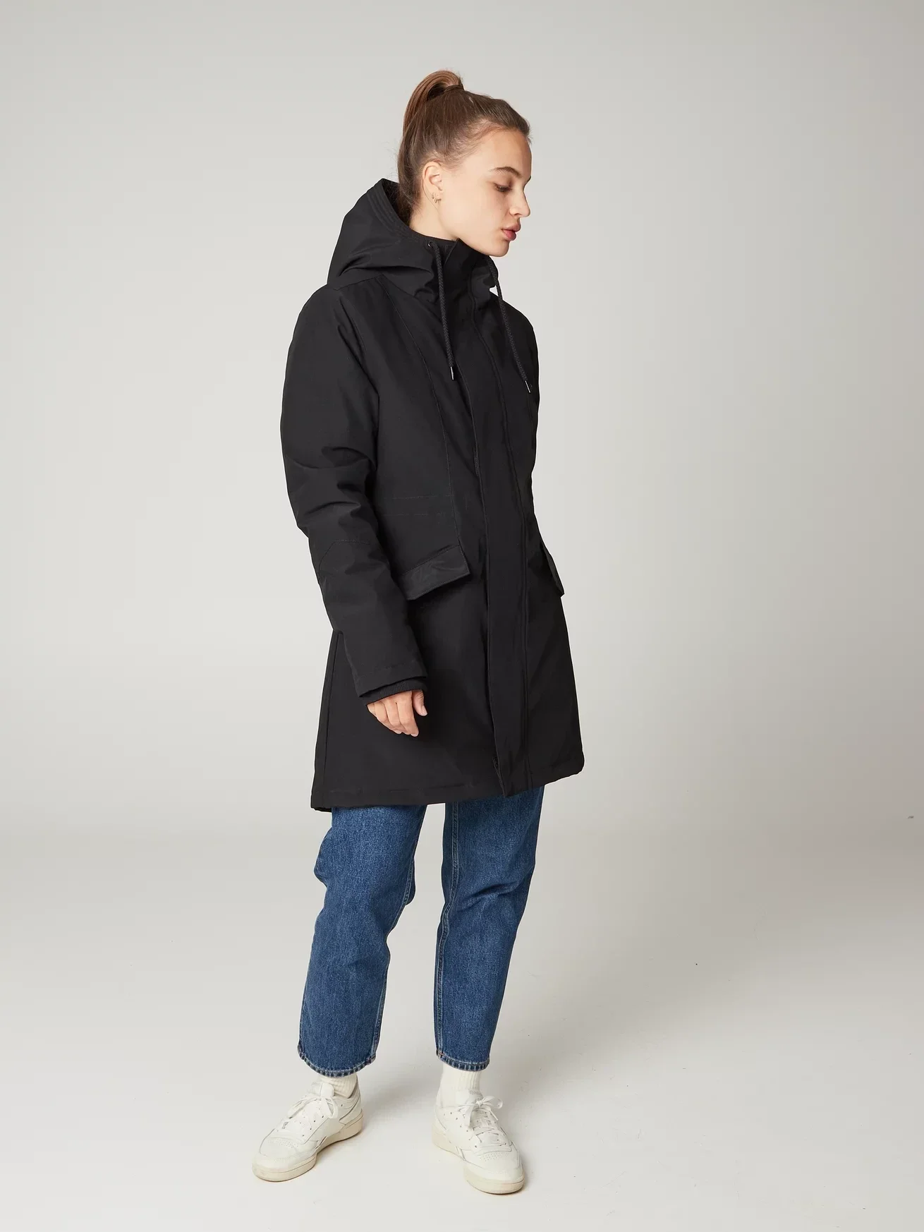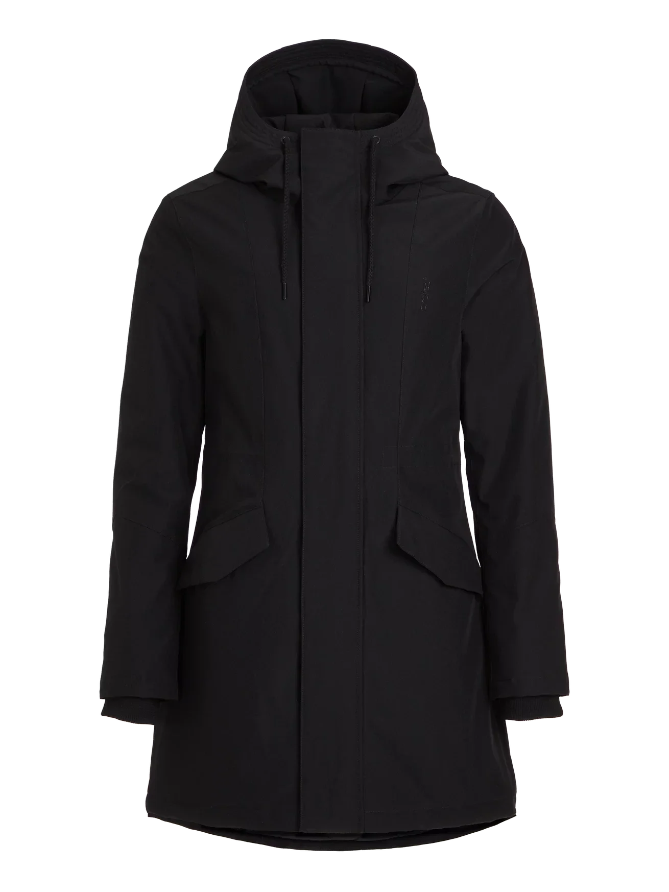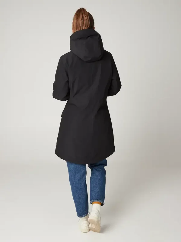Ženski dolg softshell zimski plašč Protest s kapuco, dvosmerna zadrga, notranja rokavička, Geotech vodoodbojnost / zračnost 10000 mm/24hBarva: črna