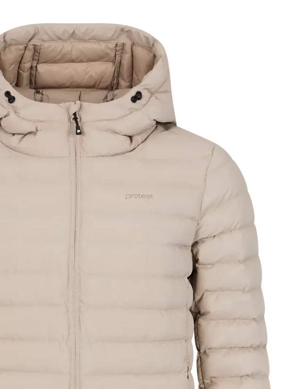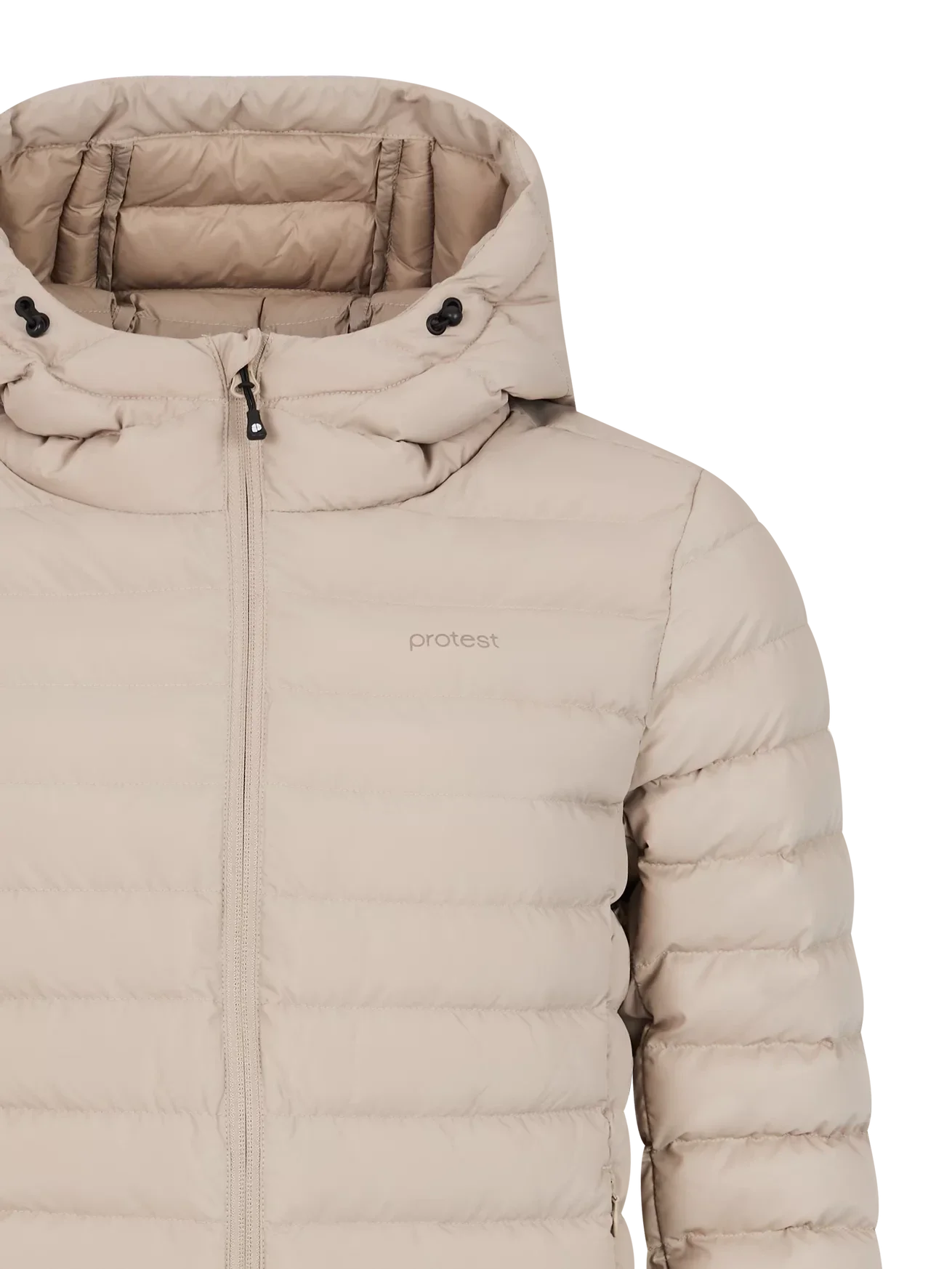 Ženska zimska 'outdoor' jakna Protest s kapuco, dva stranska žepa z zadrgo, ščitnik za brado. Termo polnilo, ki zadržuje toploto, a hkrati odvaja pot.Sestava: 100% poliesterBarva: bež